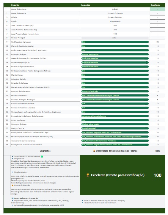 Ao final do processo, você receberá um link exclusivo para acessar seu relatório completo, pronto para ser impresso ou gerado em PDF. Esse diagnóstico detalhado mostrará o que sua fazenda já faz bem e onde é necessário melhorar para atender às normas ambientais e sociais das certificações agrícolas.